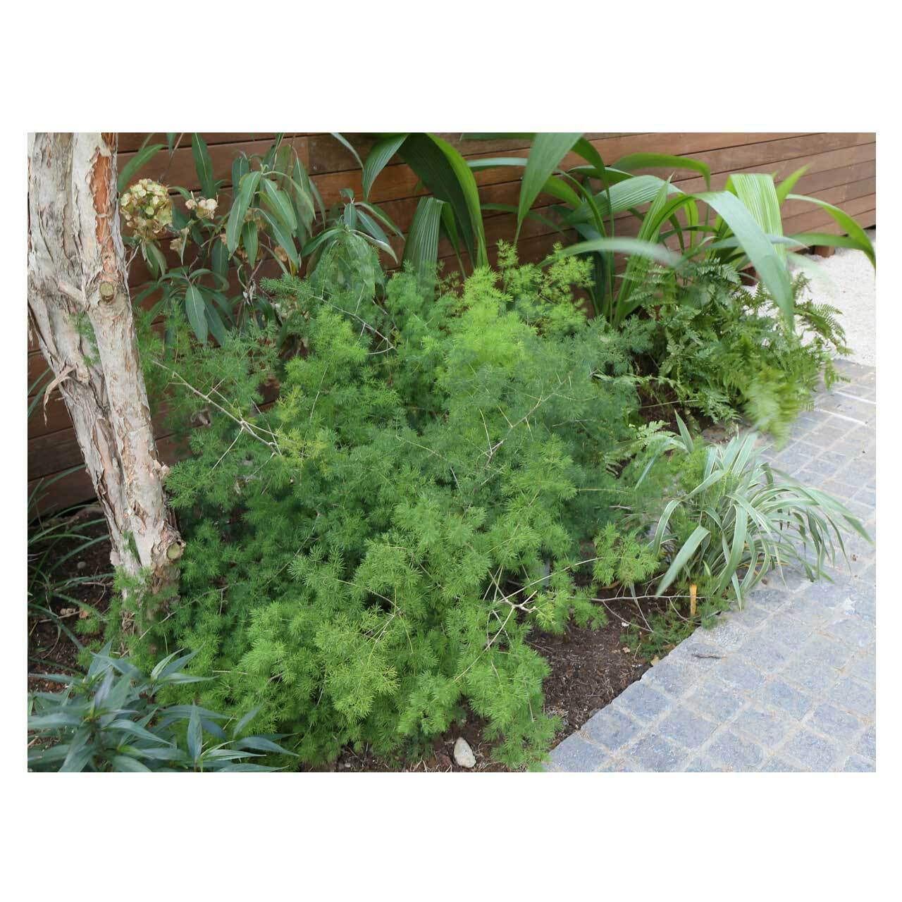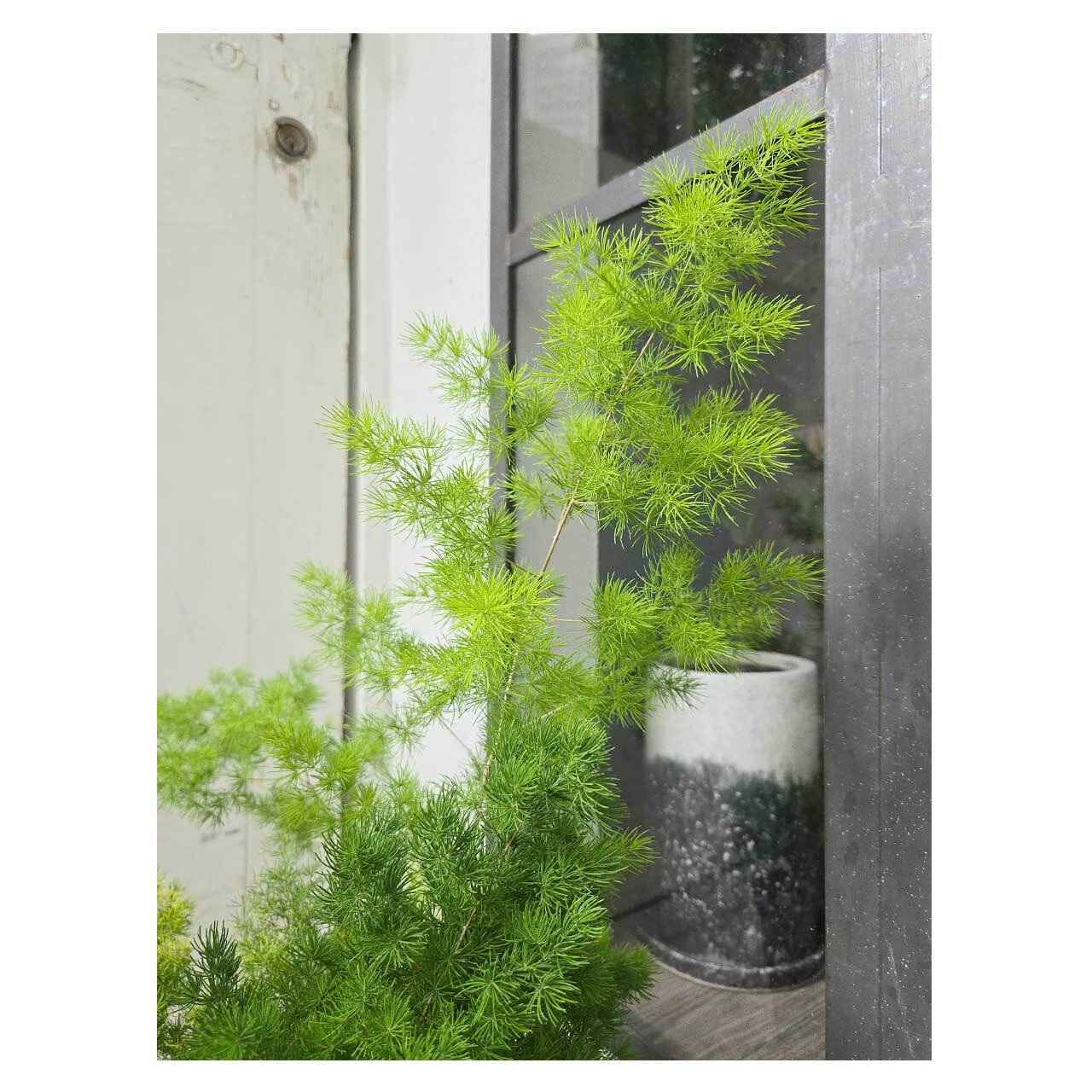 線香花火のように広がる細かな葉が愛らしい、アスパラガス マコワニー(ミリオクラダス)。鮮やかな葉の中に見える白い茎も印象的です。